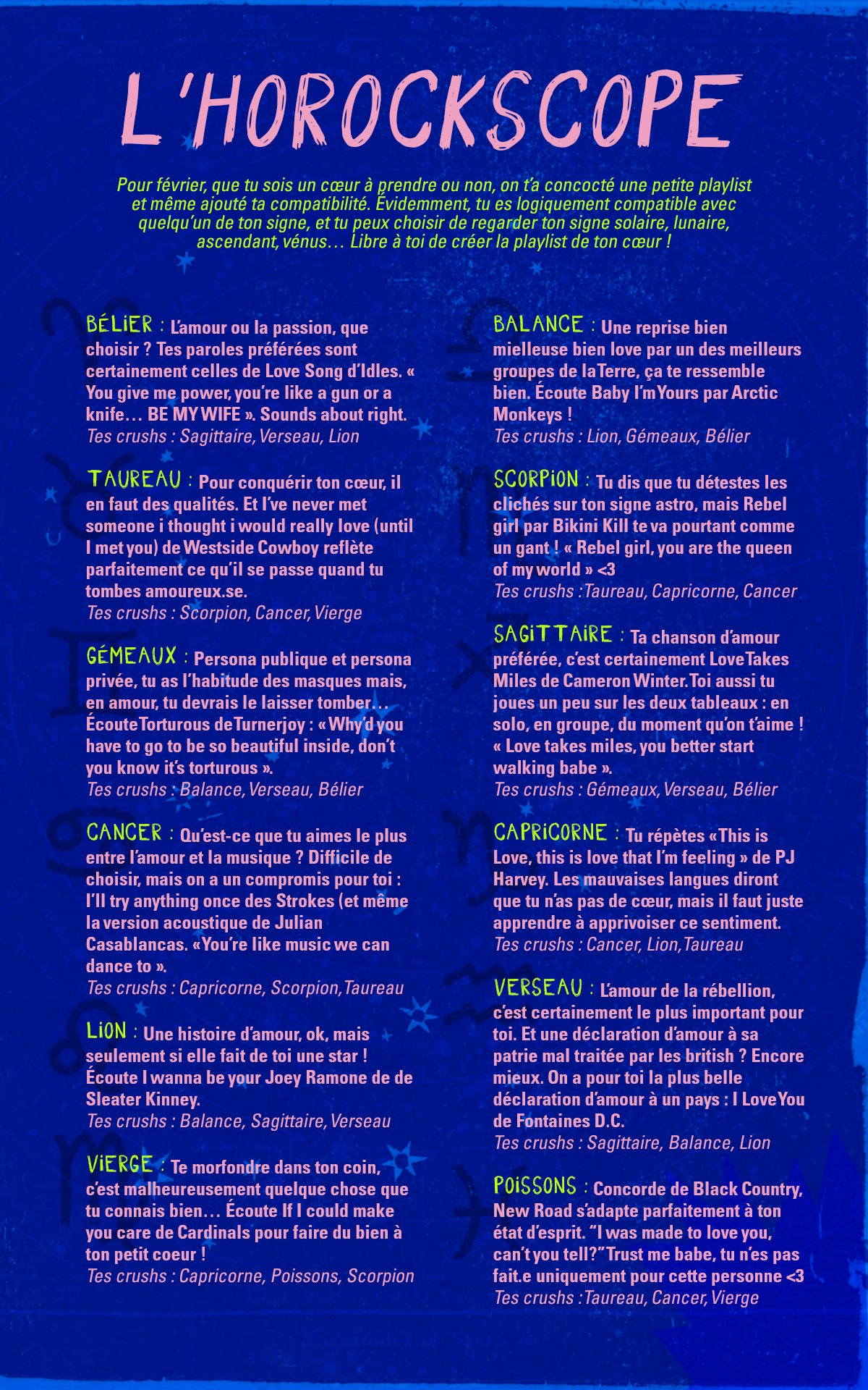 Et ça tombe bien, dans cette newsletter spéciale love vous pourrez trouver nos cartes de Saint-Valentin version indie rock à envoyer à vos crushs. On vous donne aussi quelques tips pour draguer en concert sans être relou·e. On a aussi recueilli plusieurs témoignages de rencontres en concert. On vous révèle aussi vos chansons d’amour en fonction de votre signe astro, on se demande si c’est une bonne idée de créer un groupe avec son mec ou sa meuf et on parle des meilleurs morceaux à écouter en faisant l’amour.