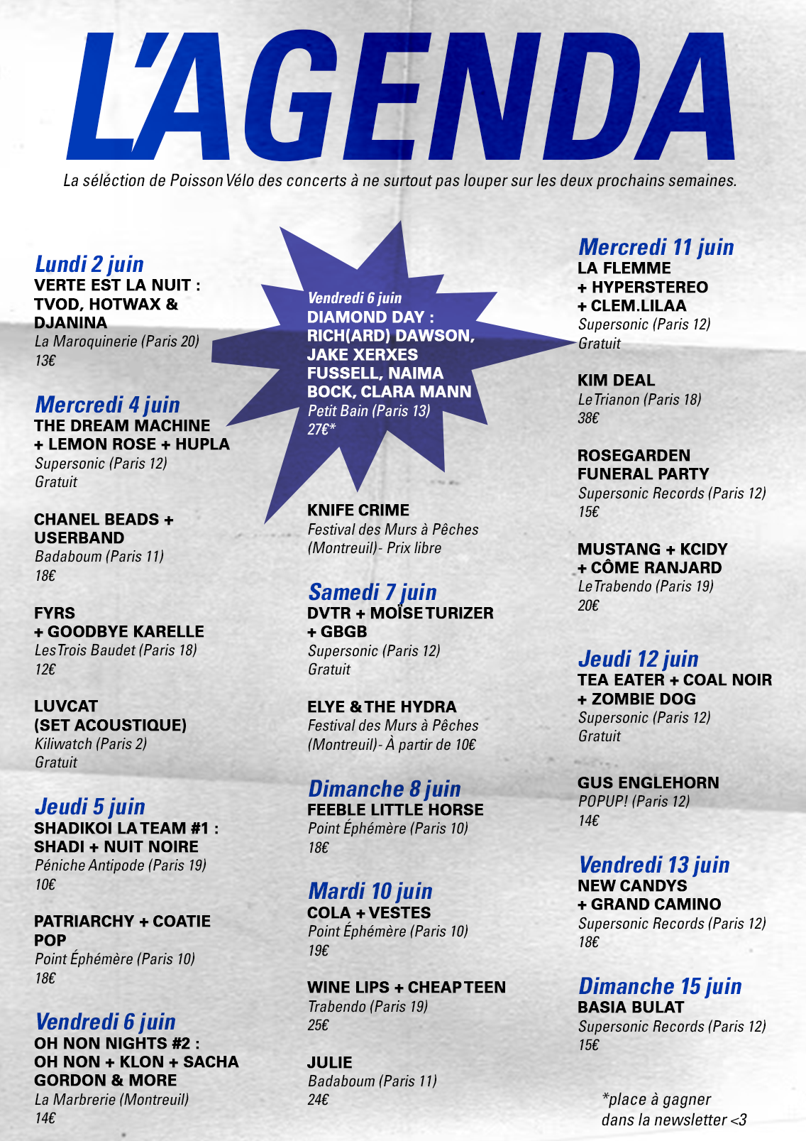 Cette newsletter a été réalisée par Lorène Bienvenu, Zoé Pinet, Nina Decup, Elisa Verbeke et Nicolas Jovovic. Partenariat rémunéré avec Vedettes pour la soirée Diamond Days – Poisson Vélo peut être amené à réaliser des partenariats rémunérés avec des acteurs culturels quand nous partageons les mêmes valeurs.