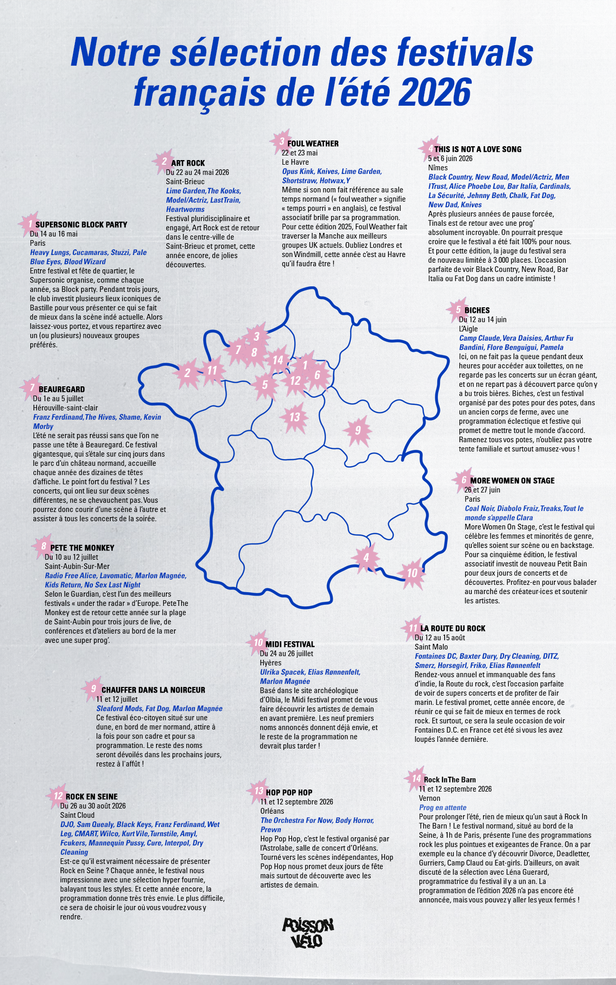 C'est bientôt l'été et donc la meilleure saison de l'année puisque c'est aussi celle des festivals. Chez Poisson Vélo, on adore les festivals. Pourtant, ils sont en danger. Dans cette newsletter, on vous offre notre sélection des festivals de l'été 2026, on parle de la réalité économique des scènes et de prévention des VHSS en milieu festif.