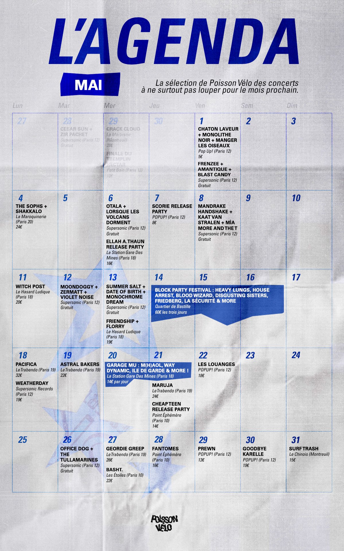 Comme tous les mois, on vous propose notre sélection de concerts pour le mois prochain. Au programme en mai : Witch Post, Weatherday, la Block Party du Supersonic, Les Louanges, Geordie Greep et bien plus. On va encore pas beaucoup dormir en mai, mais ça vaut le coup :•)